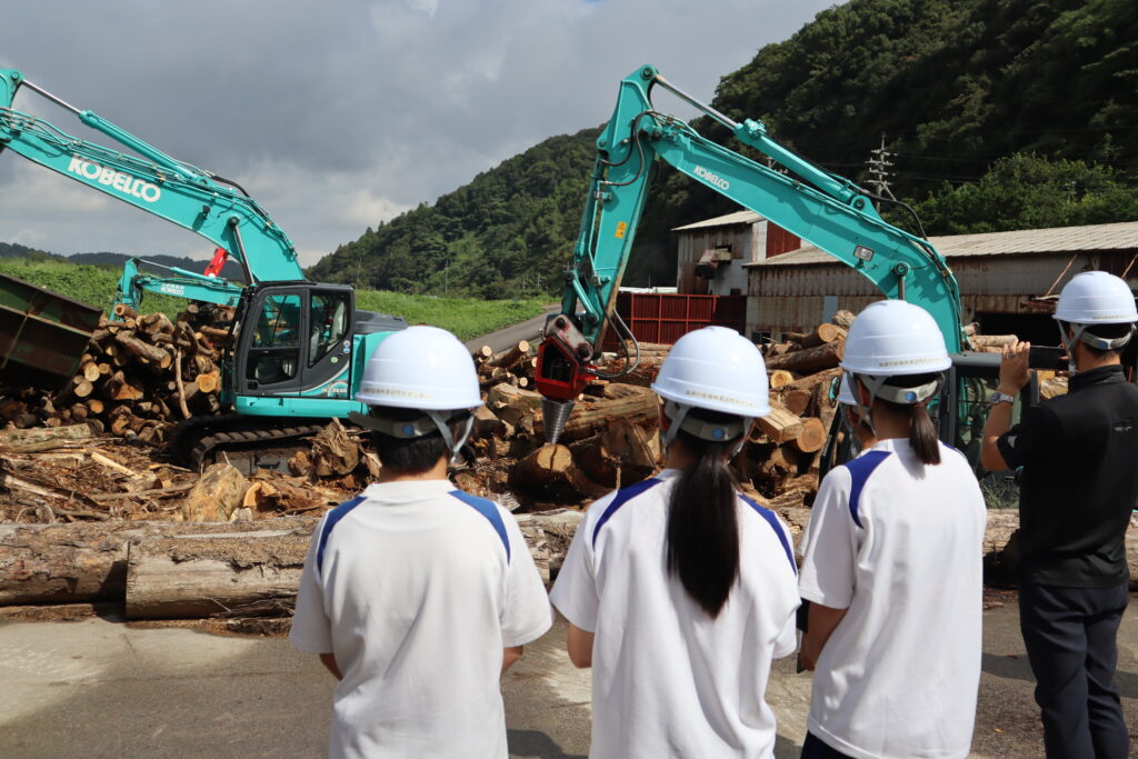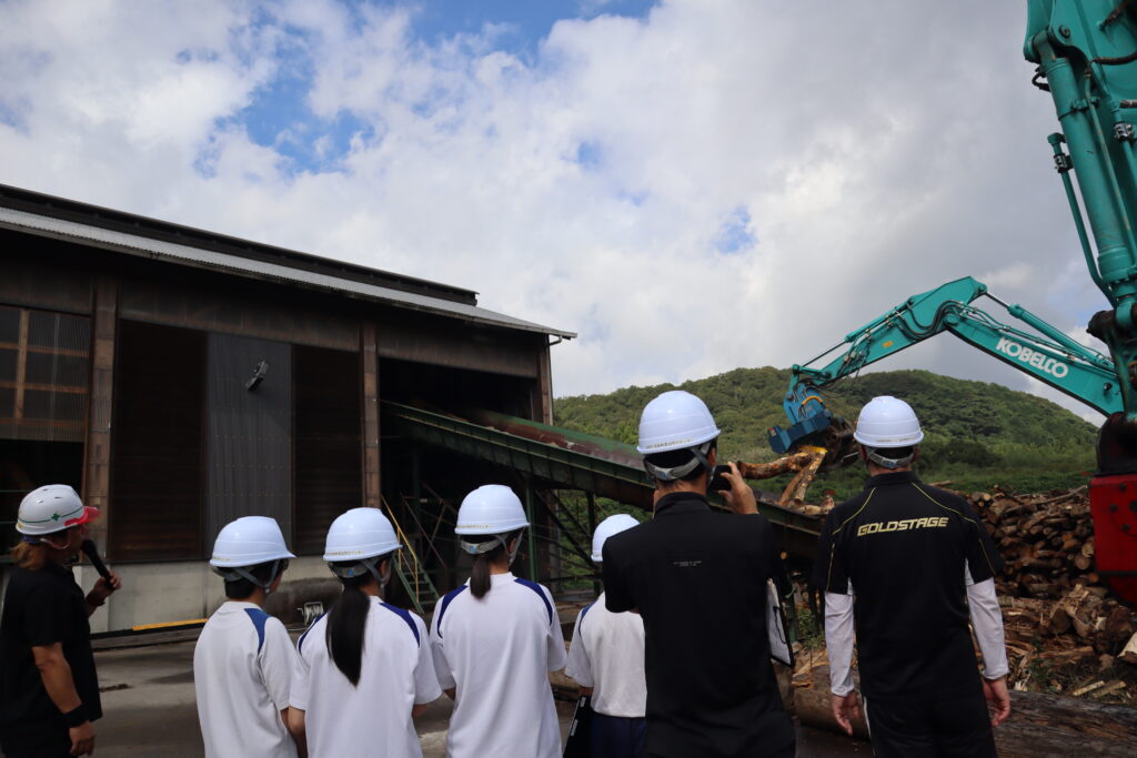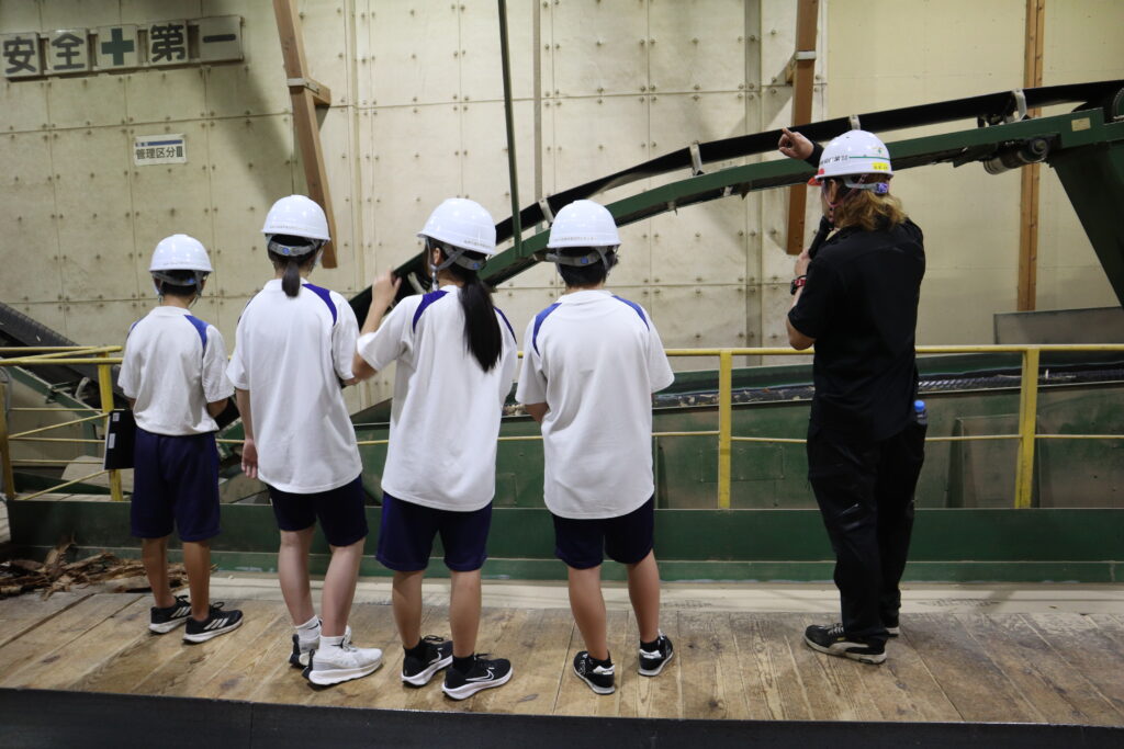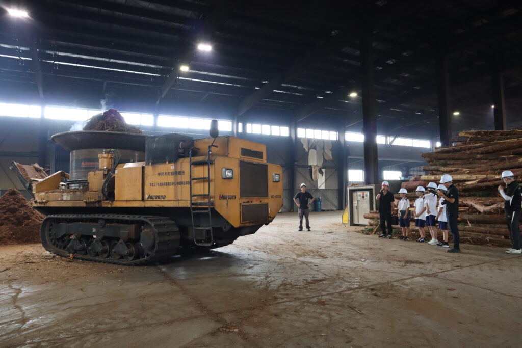 その後は、燃料チップを製造する臨空ファクトリーへ移動。大型機械「チップマックス」の大音量と飛び出すチップの迫力に驚きの声が上がりました。ここでもチップを積み込むチップトレーラーの出発に立ち会うことができ、貴重な見学となりました。