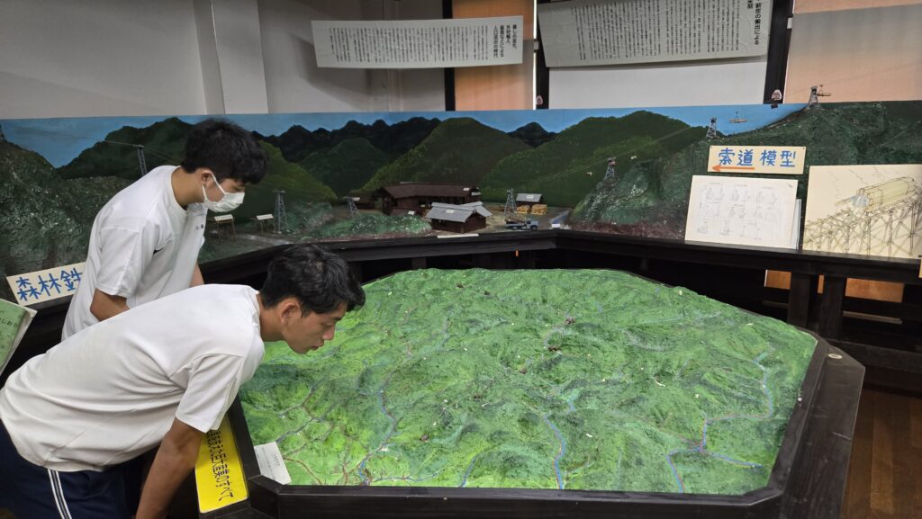 初日には伸和産業の本社、臨空ファクトリーや市内の木材市場、匹見町の広大な社有林の伐採後の造林地、匹見上公民館で匹見町の林業の歴史展示物などの見学。