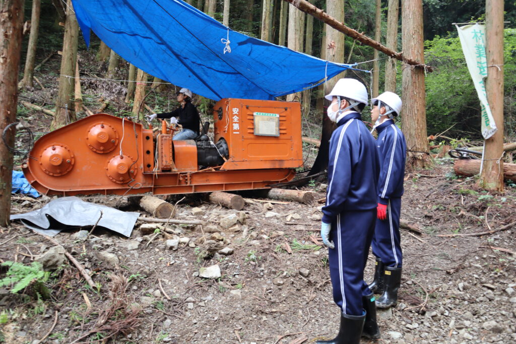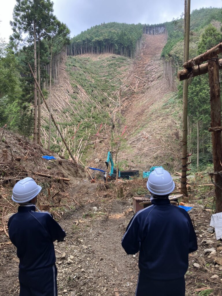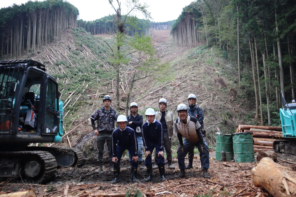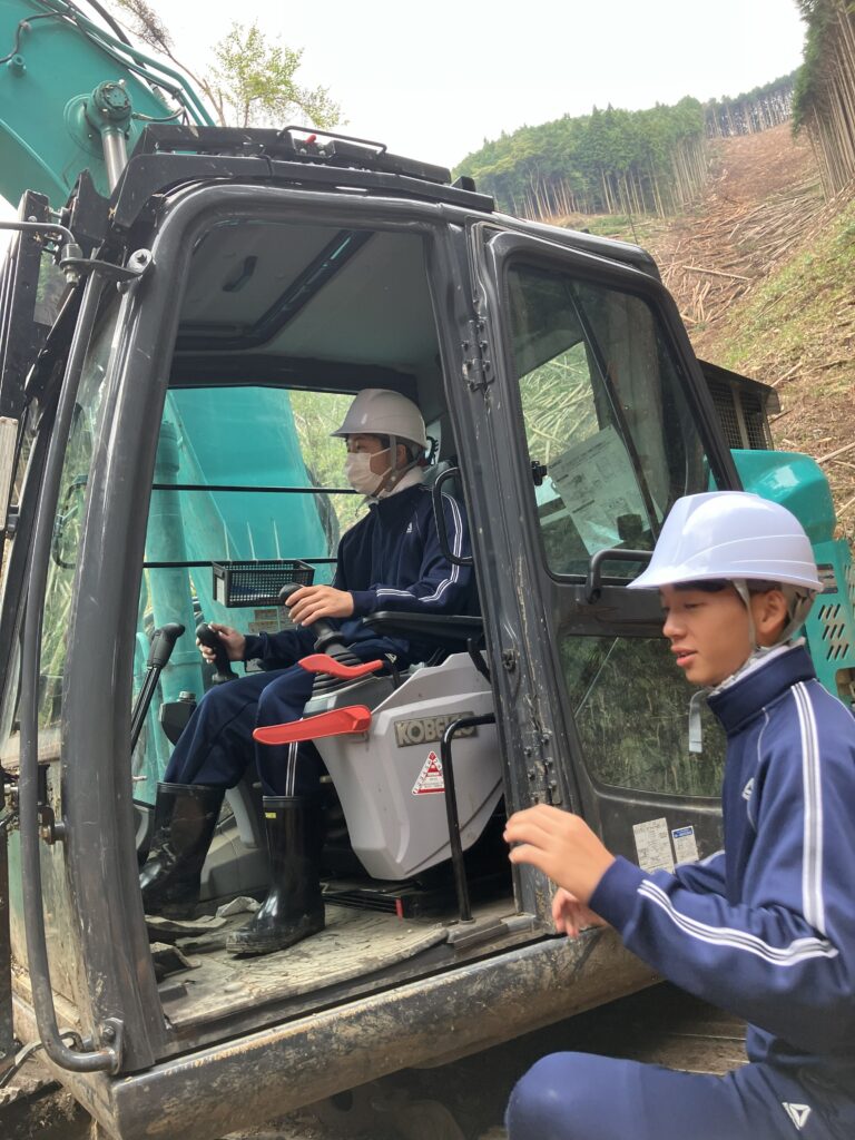 3日目は、いよいよ!当初より念願の山現場での体験です。六日市立河内にある伸和産業直営山根班の現場に行きました。時間をたっぷりとって、チェーンソー体験や重機操作を体験したり、現場で働く従業員の話を聞いていただきました。