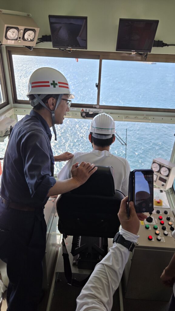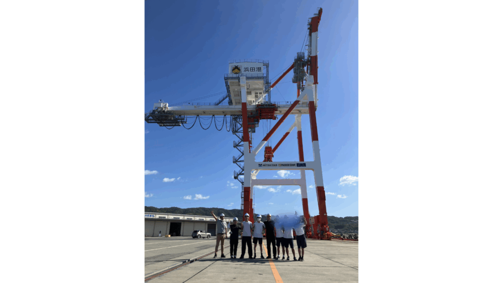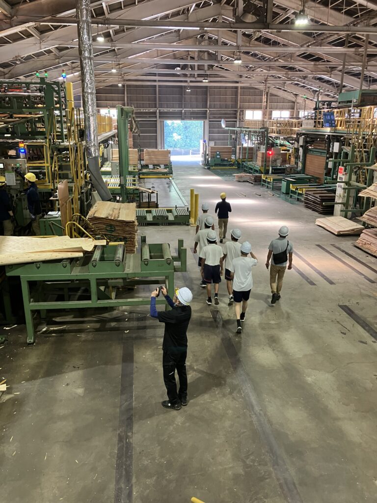 2日目は、吉賀高校からインターンシップに来られていた生徒さん2人も同行して、伸和産業が木材を納めている浜田の島根合板株式会社へ、なかなか経験することが出来ない工場内の見学。浜田港運ではコンテナクレーンに上ったり、運転席に乗せて貰ったりと大変貴重な体験をさせていただきました。