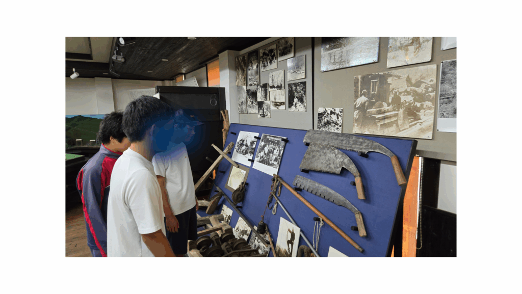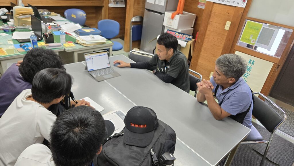 2025.10.8~10.10の3日間、地元の横田中学校より3年生3名が職場体験に来られました。まずは伸和産業の概要や、森林・林業・木材産業の仕組みについて学びました。匹見町道川にある社有林の大面積造林地そして匹見上公民館で匹見町の林業の歴史について学習しました。