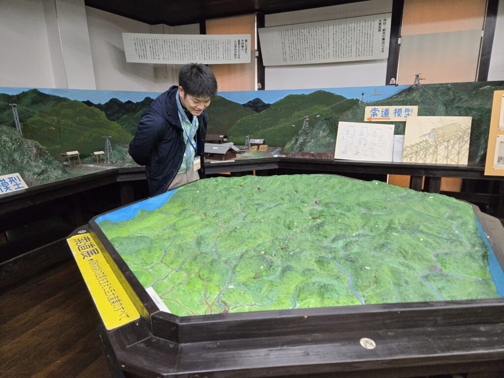・初日は、篠原社長と挨拶・会談の後、青山常務から弊社の概要説明を受けたあと、匹見上公民館に展示してある総延長30㎞に及ぶ索道の模型など、かつて林業で栄えた匹見町の歴史を学習し、道川にある弊社の約150haの大面積皆伐地に植林されているヒノキの人工林を見学しました。その後、 弊社の臨空ファクトリーの燃料チップ工場と本社工場で製紙用チップの製造行程を見学しました。