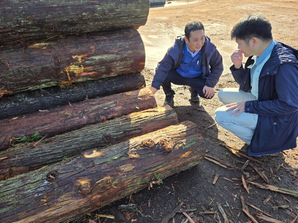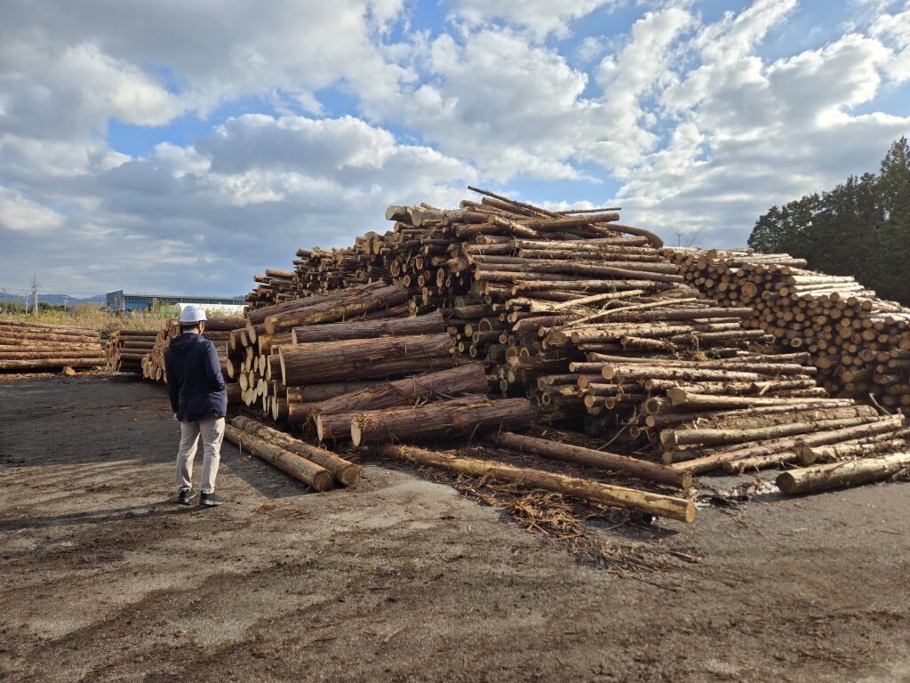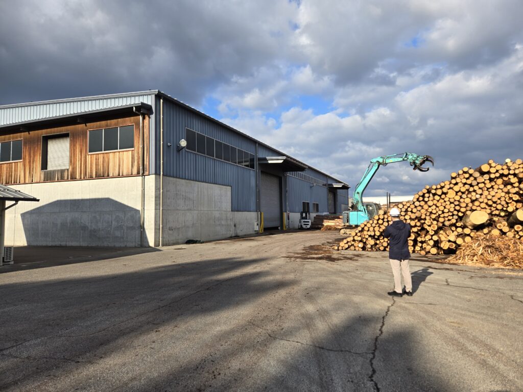 ・4日目は川下の学習ということで、佐々木馬一商店の阿知波雄一郎社長にお願いして製材所を見学させていただきました。約1時間にわたってとても丁寧に説明いただき、吉本さんも良い勉強ができたと思います。続いては、益田原木市場の見学、ここでも阿知波伸次郎社長に約1時間、製品市場も含めて丁寧な説明を受けることができました。この日の昼食は、某お店でお魚メインの定食に舌鼓。午後からは、弊社のファクトリーの土場で、選木・検寸の補助作業を体験してもらいました。